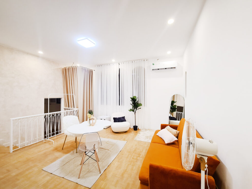 B&B Studios present a selection of six unique studio configurations. Upon arrival, guests are greeted by the inviting ambiance of the main living room, characterized by its sleek and contemporary design. Complete with a cozy couch, rug, and bean bag chair ensemble, the space exudes a welcoming atmosphere. Enhanced by natural sunlight filtering through the windows, the room’s white matte walls and trendy decor contribute to its uplifting vibe.