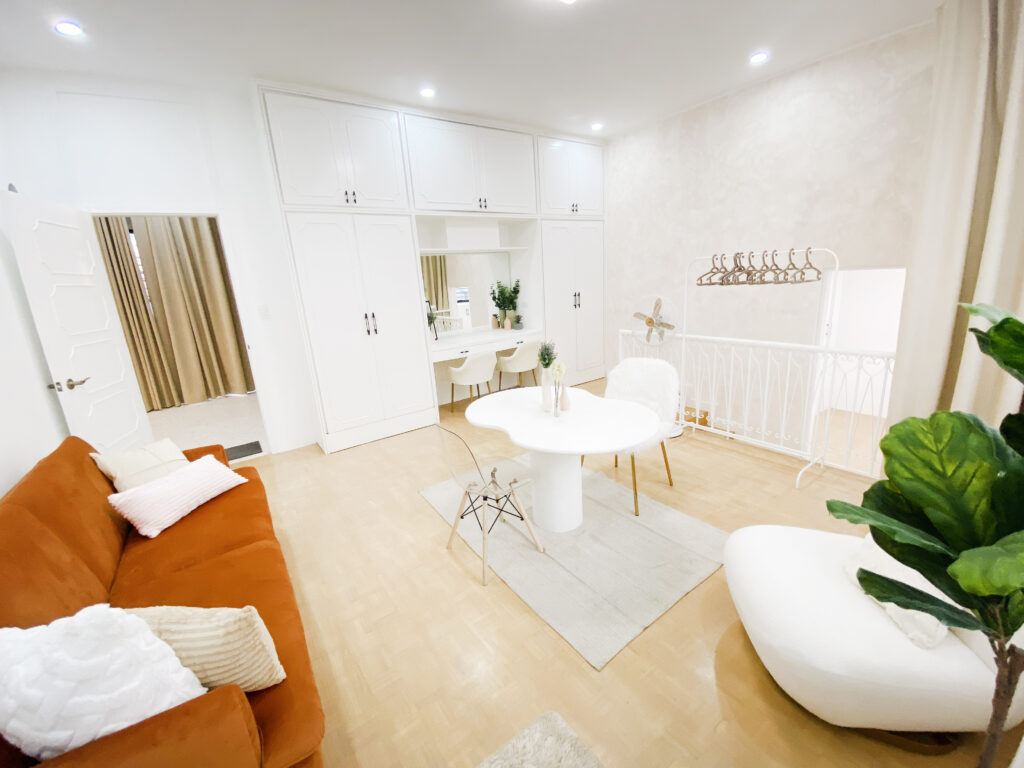 Ascend to the second floor, where you’ll discover two spacious concept rooms waiting to bring your creative visions to life. These versatile spaces offer plenty of room for customization, with a selection of colored backgrounds to suit any theme you have in mind. In one of the rooms, you’ll find a stylish vanity desk and a large mirror, perfect for setting up makeup or glam shots and for quick touch-ups between takes. With ample natural light streaming in through the windows, both rooms exude a calming yet inspiring atmosphere, making them ideal settings for any shoot.