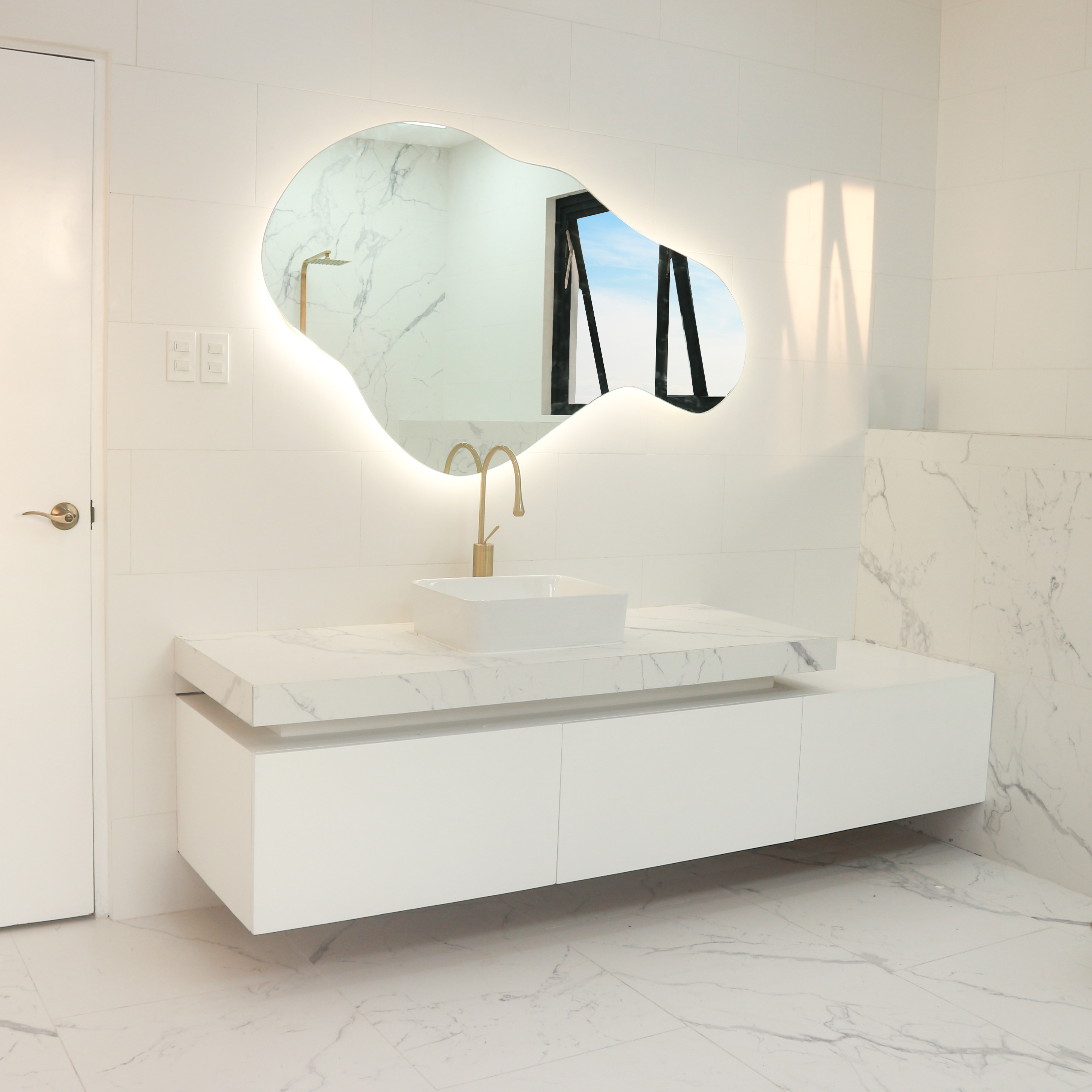Explore one of the most captivating spaces at B&B—their spacious bathroom, which doubles as a stunning backdrop for your shoot! With its white marble tiles and contemporary design, this bathroom radiates a fresh and inviting atmosphere, perfect for enhancing any bathroom-related content. Thoughtfully designed to minimize unwanted reflections, the walls and tiles boast a matte finish, ensuring a seamless setting for your shoot. To brighten up your setup, golden fixtures and panel lights are strategically placed, illuminating the space with a soft, flattering glow. And don’t miss the movable bathtub positioned beside large frosted windows, completing the scene with a touch of sophistication.